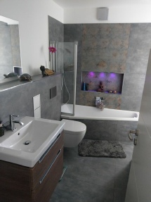 Das Tageslichtbad verfügt über Badewanne mit Duschabtrennung. Es besteht die Möglichkeit, eine separate Dusche einzubauen. Außerdem ist ausreichend Platz für Waschmaschine und Wäschetrockner vorhanden.