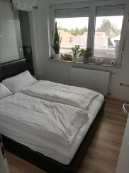 An das Schlafzimmer mit Einbauschrank grenzt ein zusätzlicher Abstellraum (bspw. für Staubsauger, Wäschetrockner, Bügelbrett etc.).